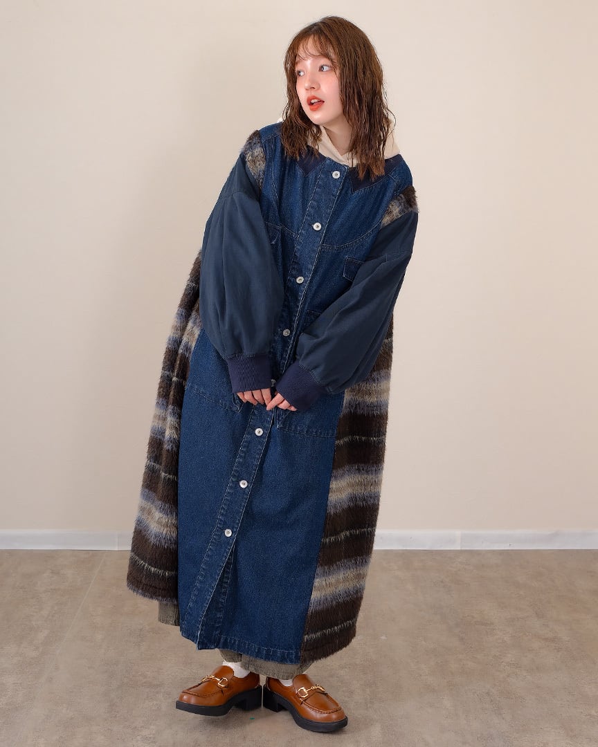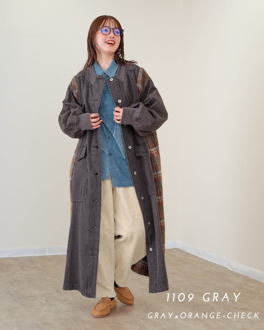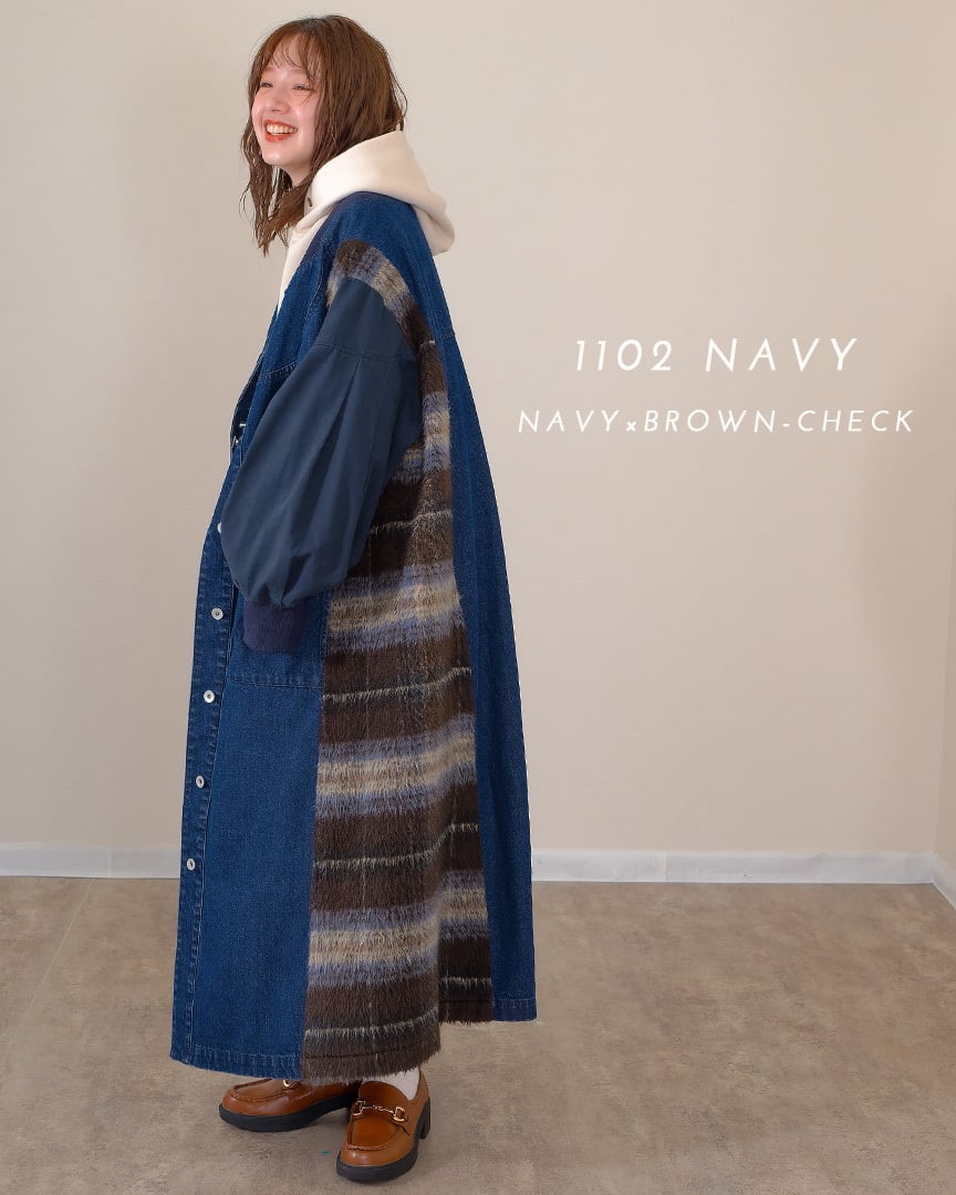 ●チェック柄のシャギー地とデニムを切り替えたロングコートです。