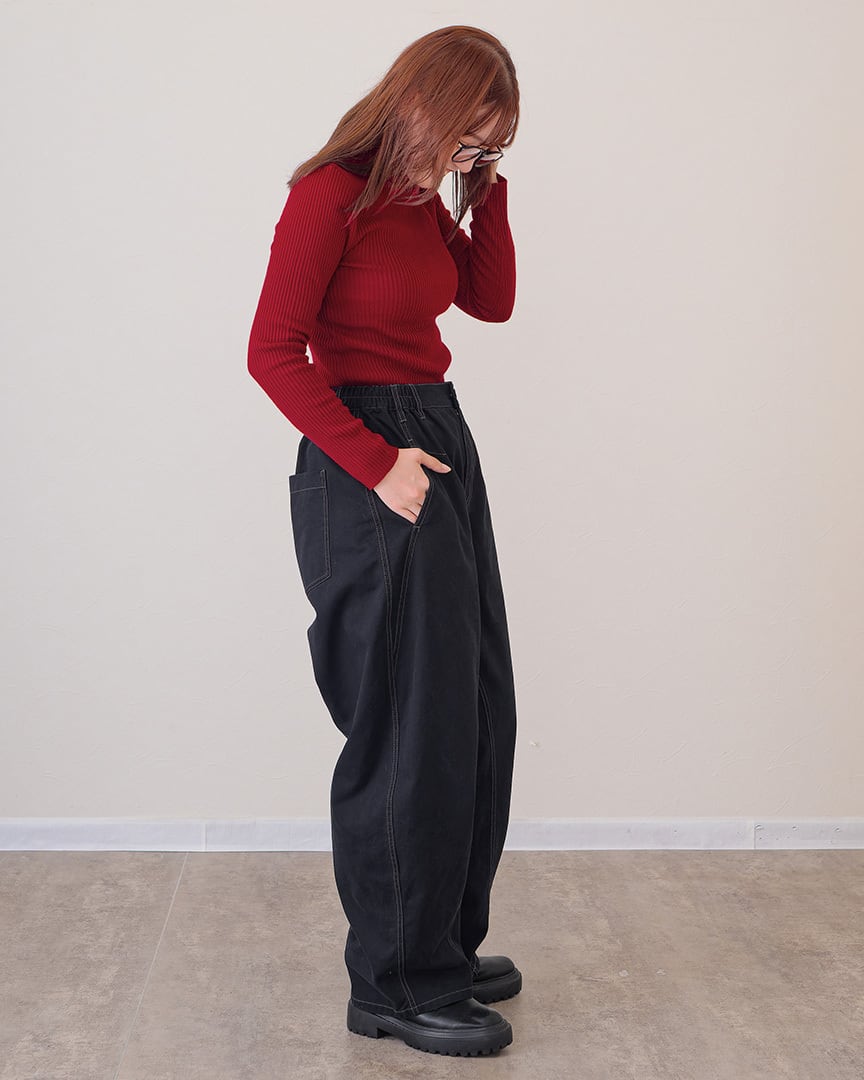 ●シルエットはトレンドのカーブパンツ。
