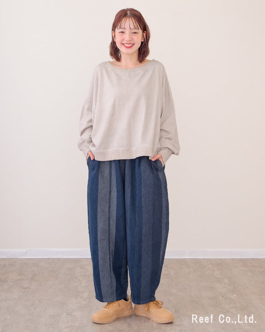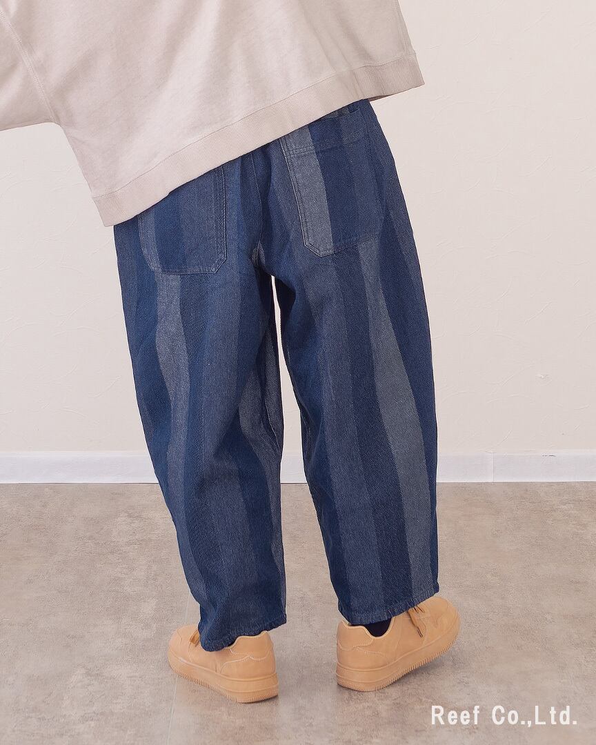 ●ジャカードデニムを使用した縦しまのボールパンツ。