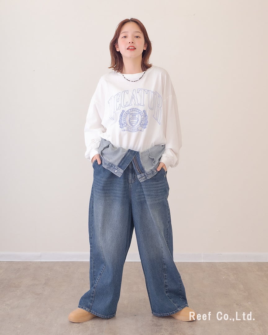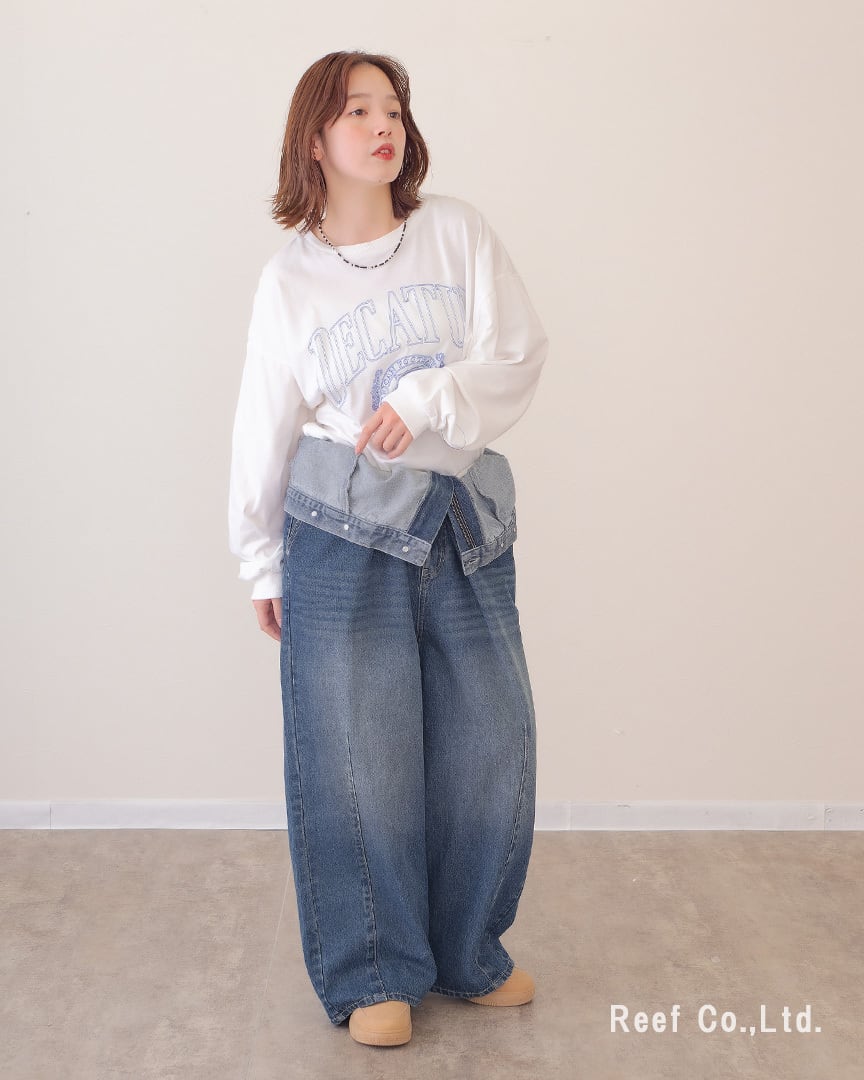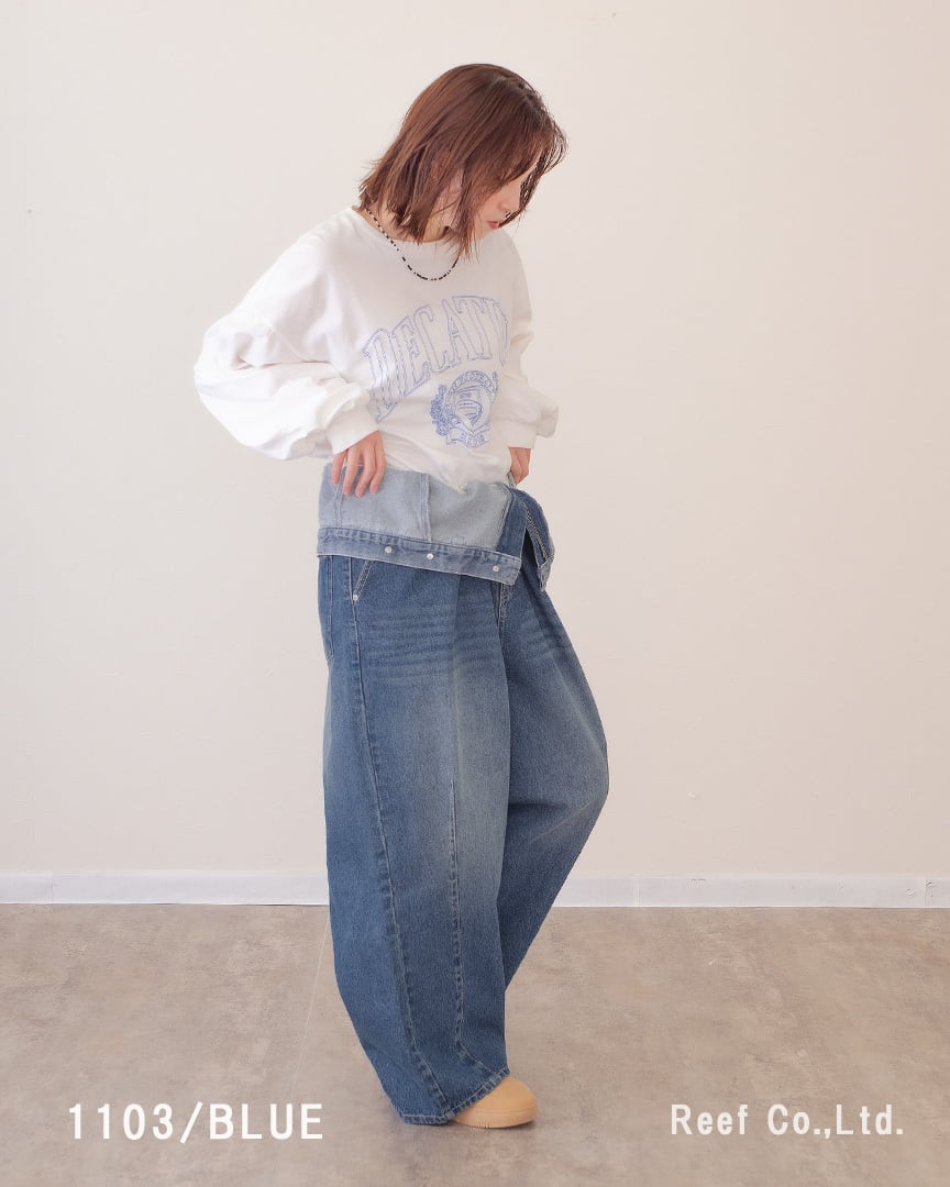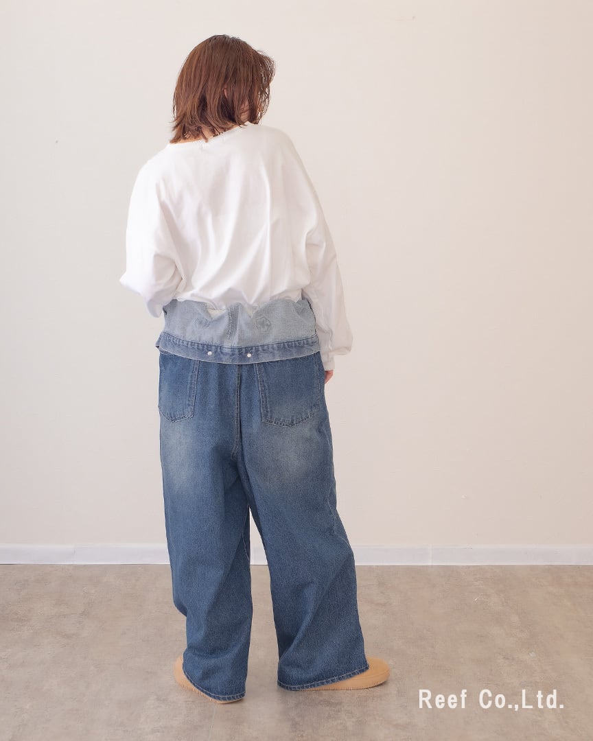 ④ウエストを折り曲げてパンツ丈を調節。デザインデニムパンツとして着用。