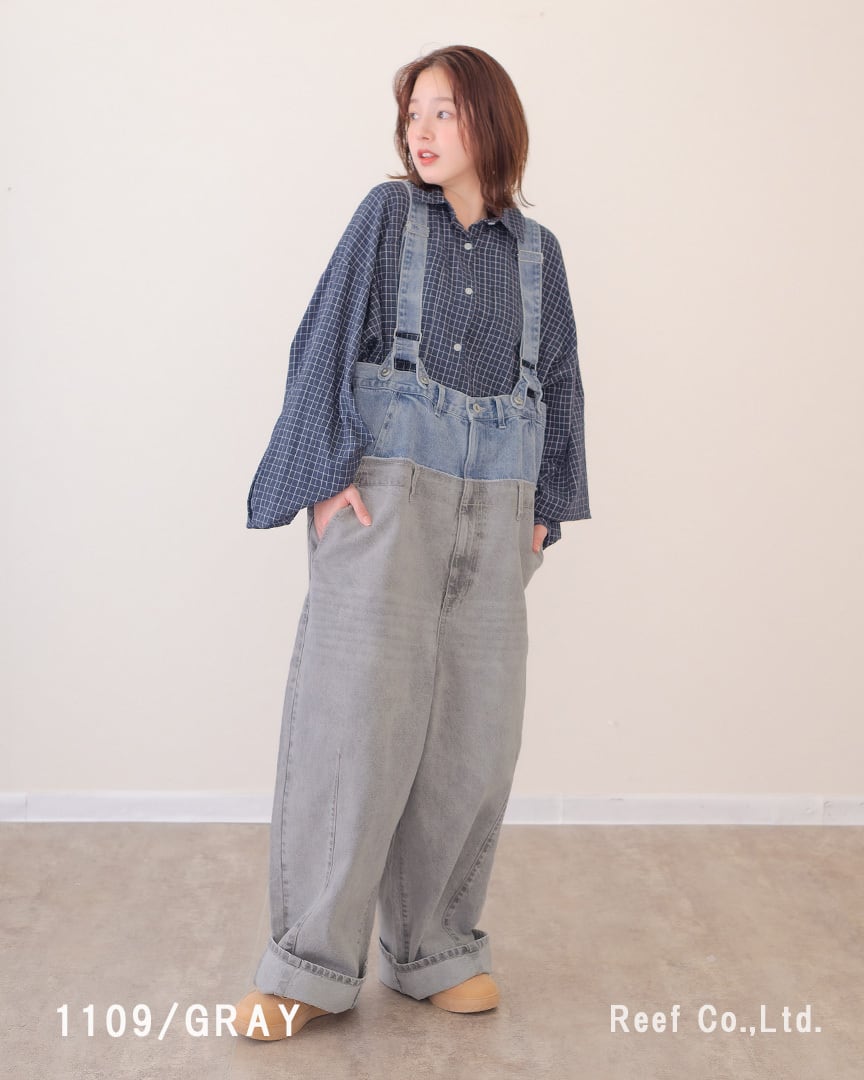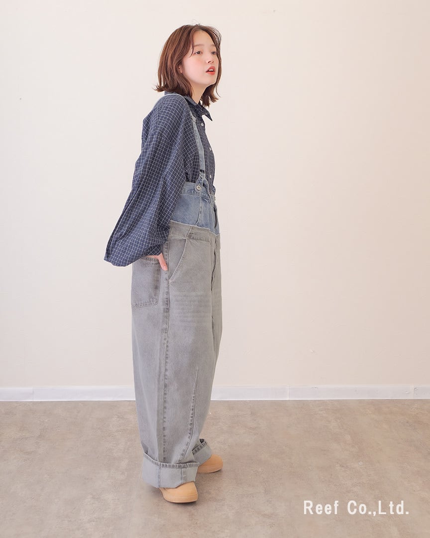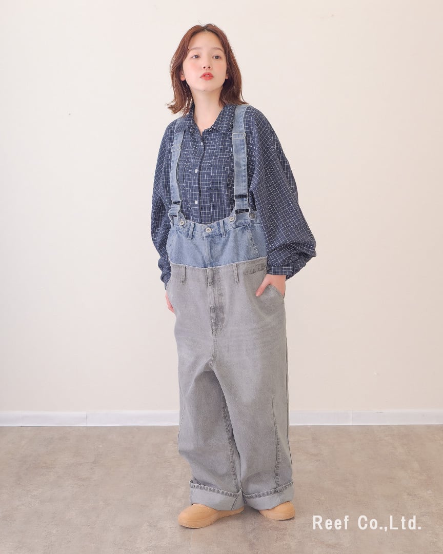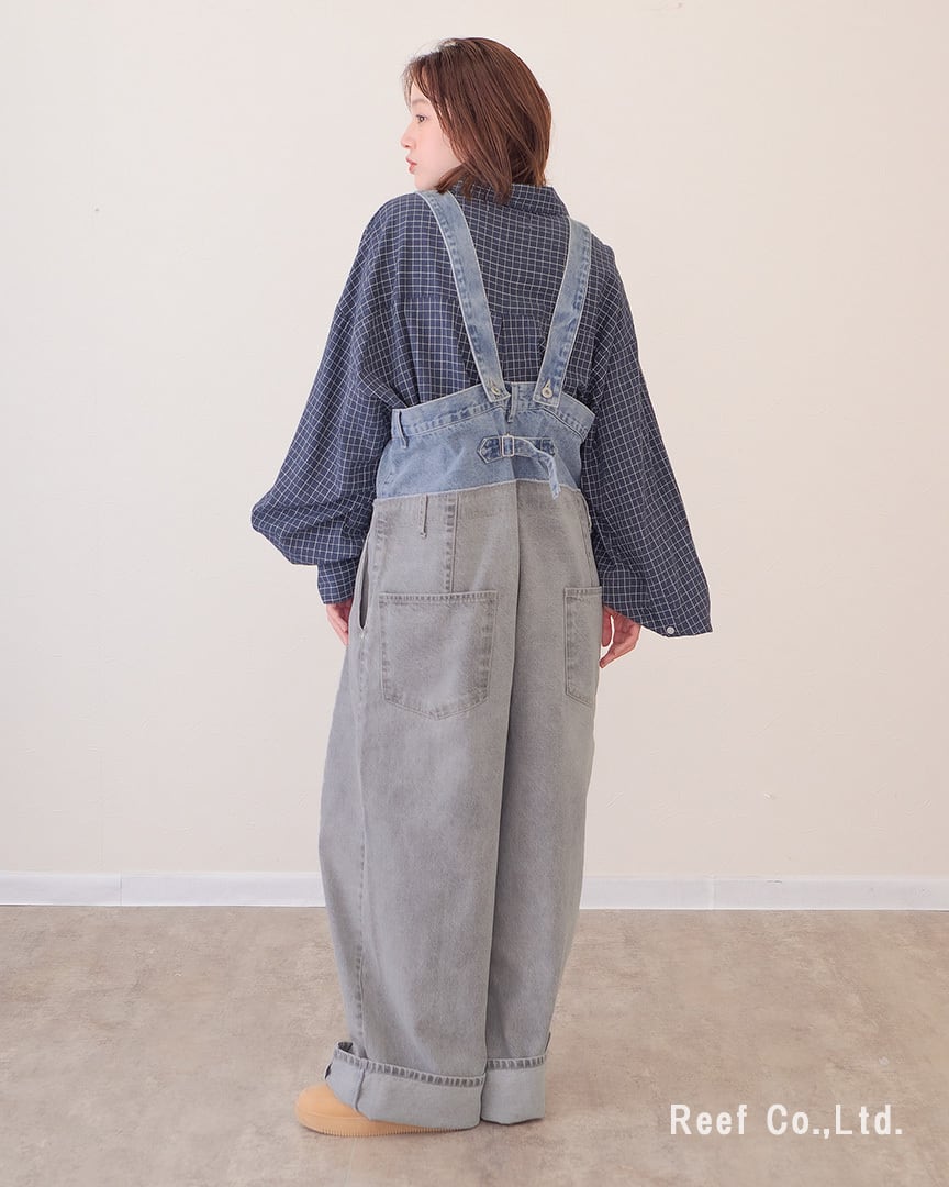 ②裾を大きめに折り曲げてサスペンダー付きのデニムパンツとして着用