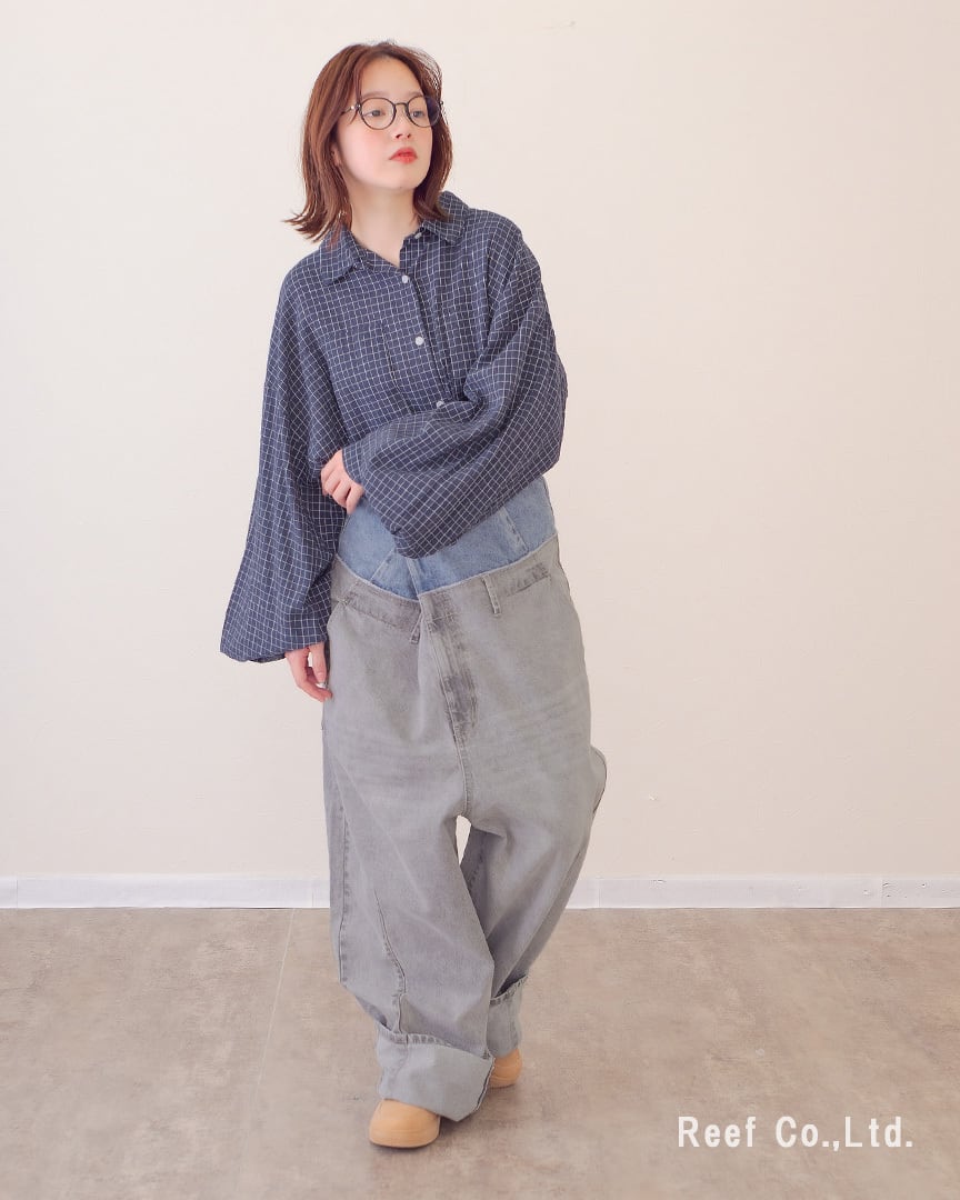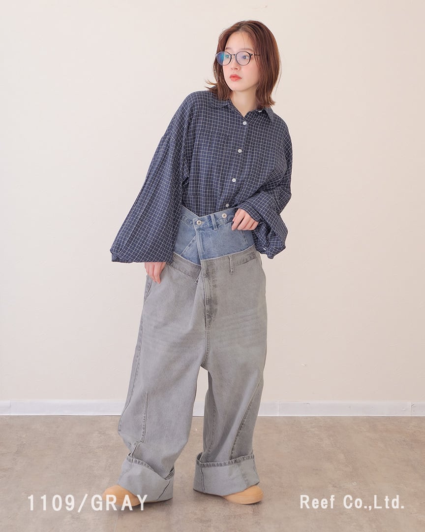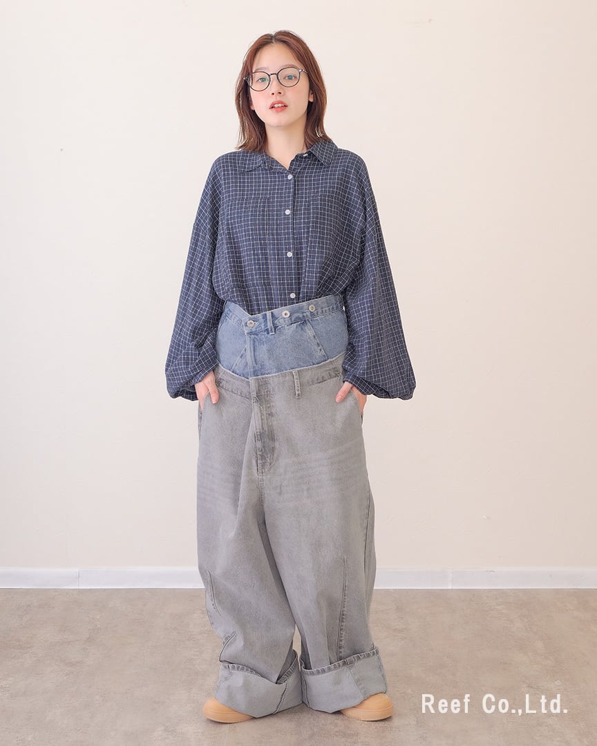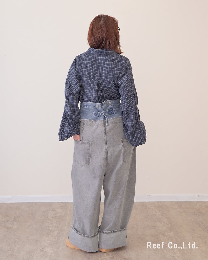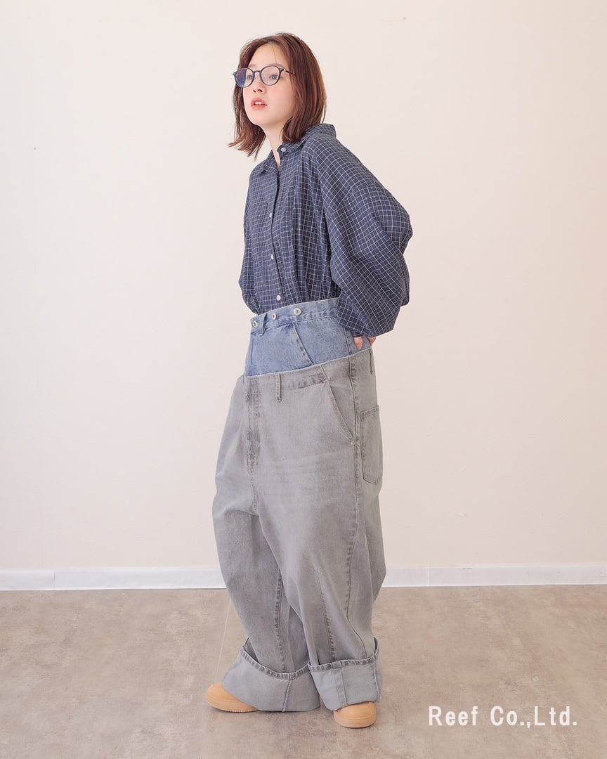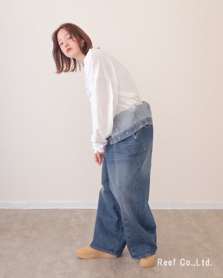 ③ウエストのボタンで幅を調節し、裾を大きめに折り曲げて履くとボリューム感あるデニムパンツに。