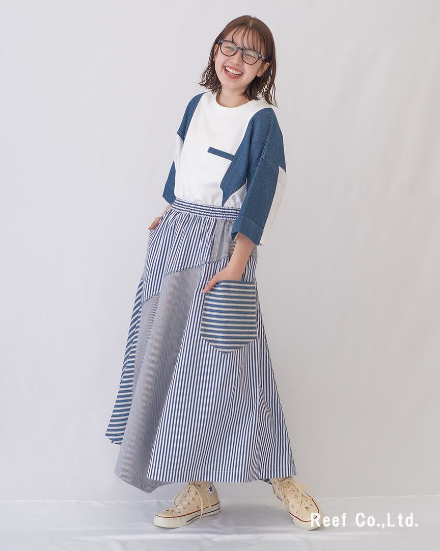 ●清涼感あるストライプと切替デザインを際立てる大人のこなれネイビーの2色展開。