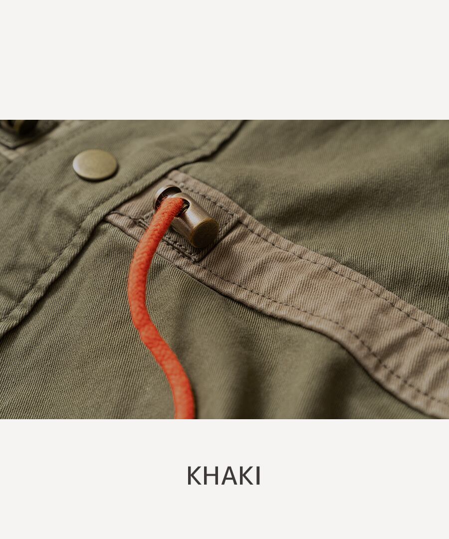 ●カーキは洗い加工を活かしたミリタリーっぽさに配色テープがポイント。