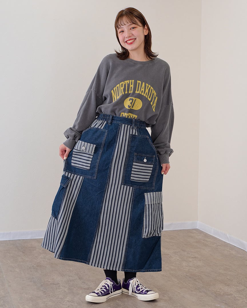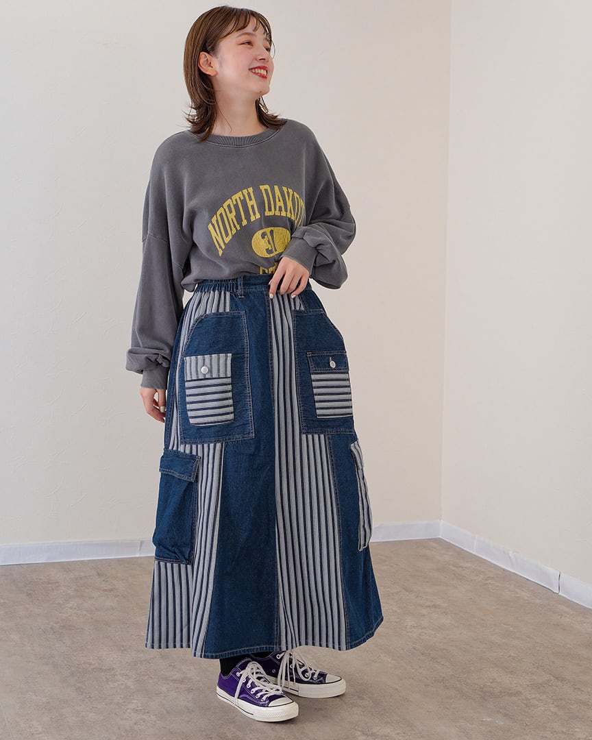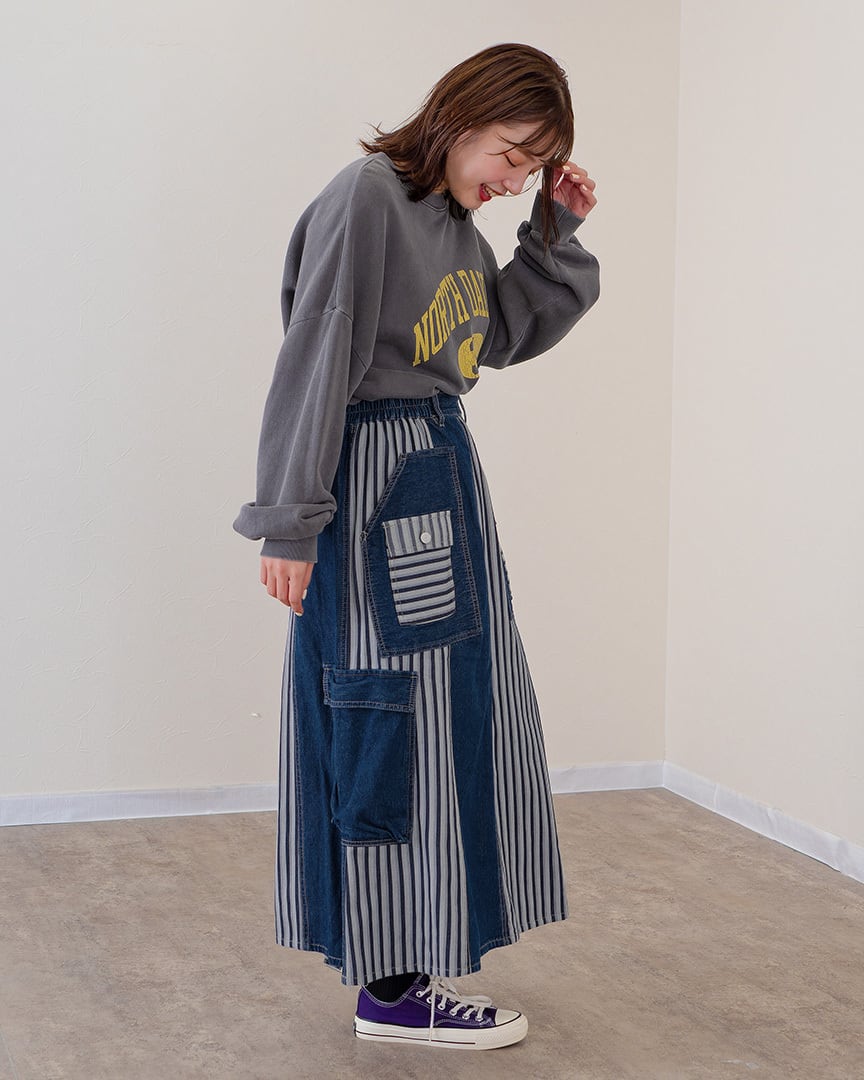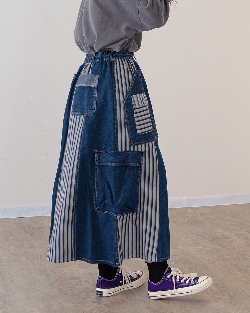 \ストライプとデニムのドッキングがポイントのAラインロングスカート/